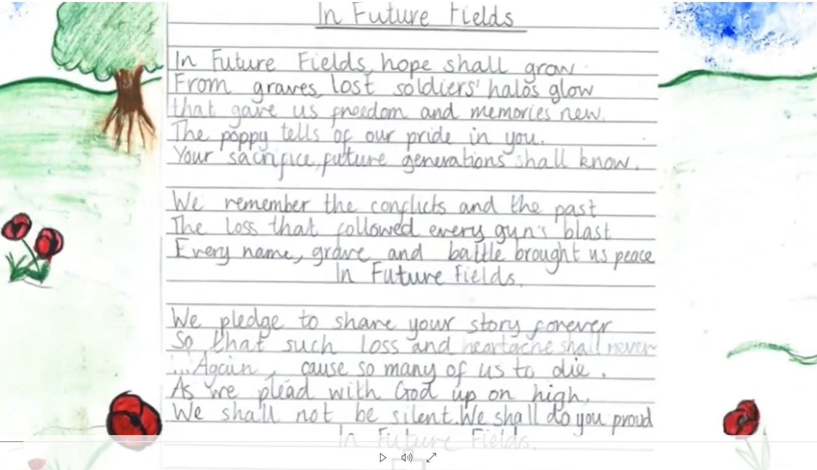 This special short film (7-minutes, 28 seconds) is about 12 year-old Sophie Henderson from Ayrshire. After winning our Poppyscotland 2019 Learning Competition, Sophie made her beautiful poem ‘In Future Fields’ into a moving song which she recorded with musician Scott Nicol with 25% of the proceeds coming to Poppyscotland. As well as featuring Sophie’s magical song and you will also hear stories about boy soldiers who fought in the trenches during World War One.